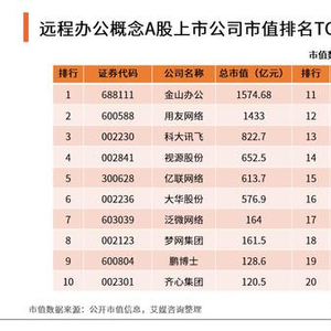 榜单数据显示,其中,金山办公以1574.68亿元总市值居首。其次为用友网络,市值同样超千亿,达1433亿元。此外,科大讯飞、视源股份、亿联网络、大华股份、泛微网络、梦网集团、鹏博士、齐心集团也跻身榜单前十。