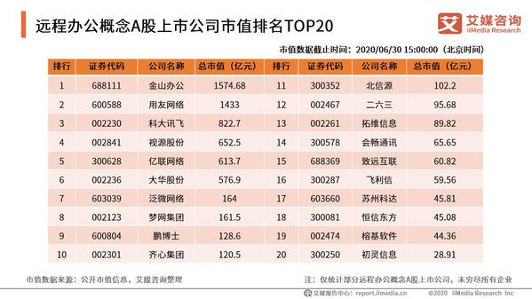 近日,iiMedia Research(艾媒咨询)梳理出“2020H1远程办公概念A股上市公司市值排名TOP20榜单”(以下简称“榜单”或“TOP20”),上榜门槛市值为28.91亿元。