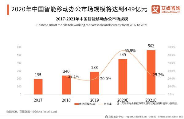 疫情催化在线办公市场爆发,随着在线办公需求增长及用户习惯养成,智能移动办公市场将更快速发展。艾媒咨询数据显示, 2019年中国智能移动办公市场规模达到288亿元,预计2020年将达到449亿元,增长率为55.9%,中国智能移动办公市场规模也将获得持续稳步增长。