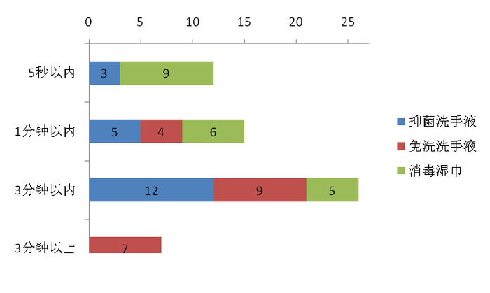 杀菌性能上,60件样品均能杀灭规定的菌落数量,但杀菌速度差异明显,其中12件样品(9件消毒湿巾,3件抑菌洗手液)杀菌最快,能在5秒内迅速杀菌,15件样品和26件样品分别在1分钟和3分钟以内杀菌,7件免洗洗手液样品杀菌略慢,用时超过了3分钟。