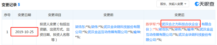 而在此前的2019年10月25日,玩偶一号发生投资人变更,增加两位投资者:合之力和陈学军。