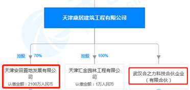 在合之力的股东之中,有一家天津康居建筑工程有限公司(简称“天津康居”),而天津康居另有一家子公司叫天津安田置地发展有限公司(简称“天津安田置地”)。