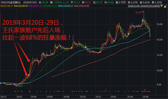 从明细表可以很明显看出,2019年3月20日-29日是王氏家族集中入场时间。由于王氏家族的集中入场,推动金运激光股价从15.15元/股,狂暴上涨至25.48元/股,累计涨幅68%,期间轻松实现4个涨停板。