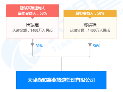 天眼查显示,有一家天津尚和鑫业旅游管理有限公司(简称“尚和鑫业”,目前经营状态显示注销),成立于2016年6月12日,陈福跃和田振惠各占50%股份,田振惠任总经理及执行董事,陈福跃任监事。说明田振惠与陈福跃关系紧密。
