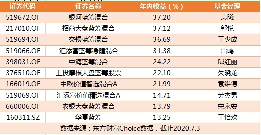 以下是年内收益居前的蓝筹风格基金,从最新十大重仓股也能看出,其投资的大部分为券商、银行、白酒等大盘股。
