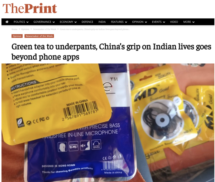 印度ThePrint新闻网7月4日文章,原题:从绿茶到内裤,中国对印度人生活的影响远超手机App 副题:没了从中国进口的8000多种商品中的大多数,印度人就无法生活。