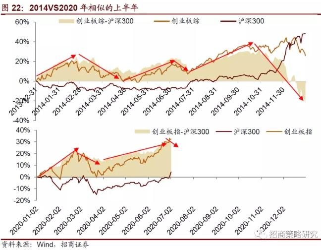报告认为,相似的宏观背景下2014和2020上半年A股风格相似。但差异之处又决定了2020下半年与2014下半年不尽相同,将会呈现轮涨、混合的风格。