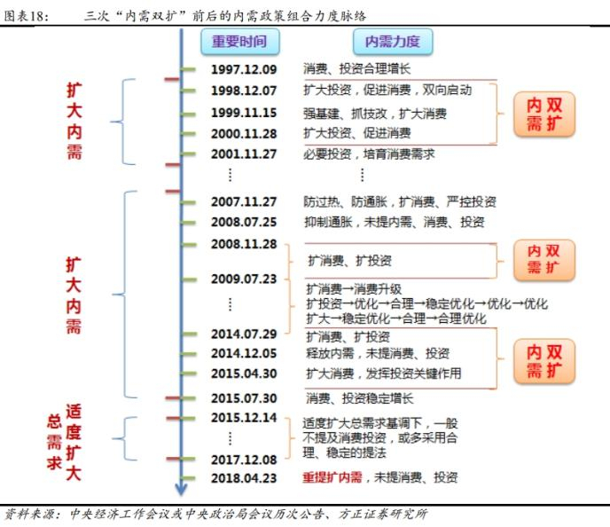 报告分析,从1998年首提“扩大内需”战略起到2015年期间,总共经历了3次内需加力升级到双扩的完整周期,而这3次都伴随着大牛市的行情。
