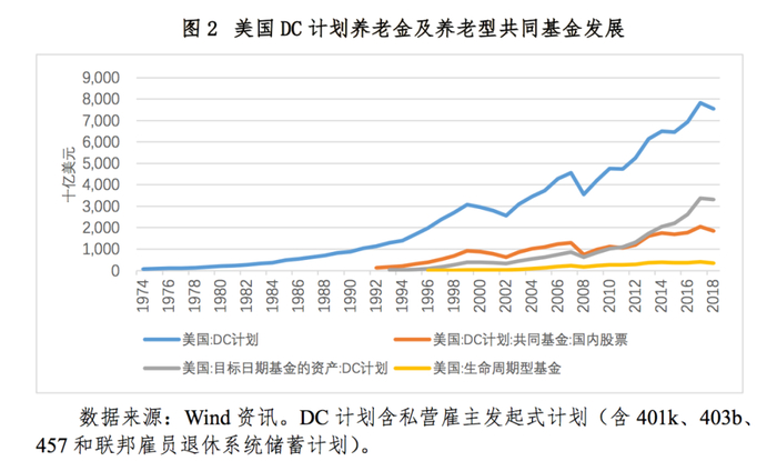 对于国内市场而言,长期以来散户化的投资者结构导致股票市场和基金产品处于频繁交易和风格轮动的格局中。根据Wind数据统计,2018年底机构投资者占A股总市值的比例仅为13%(美联储2018年Q4统计数据显示美国股市中机构投资者占比为57.4%[7]),机构投资者持有公募权益类基金的比例(30%)也显著小于个人投资者,但这一现象正在逐渐改善。2018年3月证监会发布《养老目标证券投资基金指引(试行)》,提出“养老目标基金应当采用基金中基金形式”,同年4月,财政部等五部门发布《关于开展个人税收递延型商业养老保险试点的通知》,开启“个人商业养老金资金账户”,并在未来将公募基金纳入投资范围;境外,主要指数纷纷纳入A股,2019年MSCI两次提升A股纳入比例,在2019年底完成把A股纳入比例从5%提高到20%。这些都将逐步加强长期机构投资者在股票和公募基金的市场参与程度。从美国的历史经验看,随着机构投资者比重增加,长期价值投资得到积极推动,从而带动了共同基金规模的大幅增长以及养老型基金产品的创新和发展(图2)。