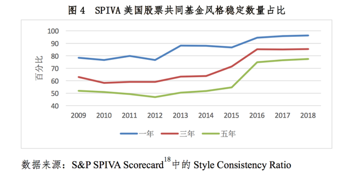 相对来说,成熟市场的基金管理更规范,更精细化,较少出现风格漂移的现象,但其实也是经过长期发展和进化的结果。美国市场历史上曾出现过多次的风格漂移案例,包括1980年代的富达麦哲伦基金(Fidelity’s Magellan Fund)[13]和1990年代的先锋探险家基金(Vanguard’s Explorer Fund)[14],投资者不得不向SEC呼吁提高基金信息披露的频率和内容,于是SEC于2004年要求基金公司必须进行季度信息披露[15]。尽管如此,S&P的风格评分(SPIVA: S&P Indices Versus Active[16],该评分用于评估基金与其风格指数的偏离程度)结果显示,在2005年至2009年之间,美国还是有一半股票基金的投资风格发生了漂移[17]。不过,根据S&P统计的投资风格稳定率,自2009年以后,美国保持投资风格稳定的股票基金的比率明显上升(图4)。