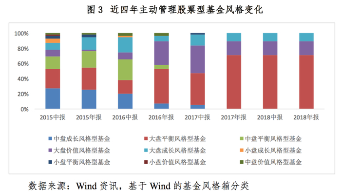 体现为基金投资股票的基本面风格的变化,较为极端的例子是基金名称明确指向大盘价值投资,但实际投资风格却是小盘成长(或者反之)。此类风格漂移会导致投资行为趋同的跟风效应,加剧市场波动。根据成立满5年的主动型股票基金过去四年的风格分类数据(图3),在2017年之前风格切换较为明显,在2017年之后则基本都是大盘风格(包括基金名称中带有“小盘”的基金),呈现了抱团取暖的“羊群效应”。