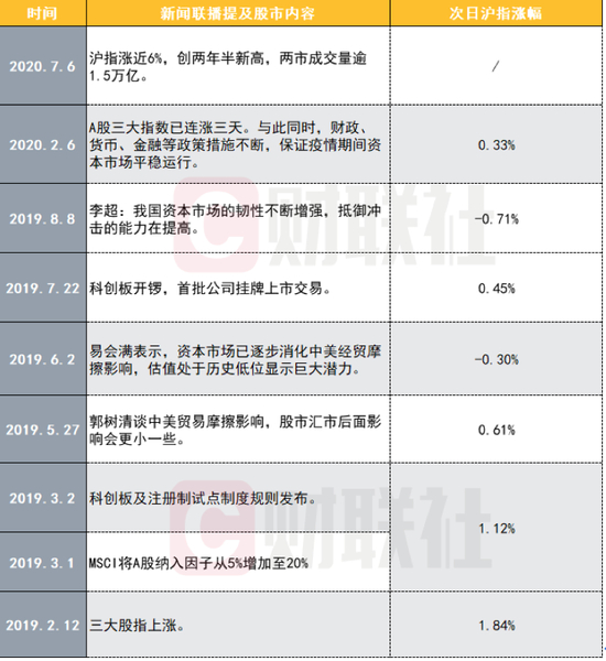 统计显示,去年《新闻联播》节目共提及股市7次,在之后股市多次走高。最典型包括去年2月11日播报“农历新年首日三大股指上涨”,之后A股走出壮阔的春季大涨行情;去年8月8日报道“证监会领导谈资本市场韧性不断增强”,之后沪指从调整低点2700多点,一路走高,重新站上3000点。