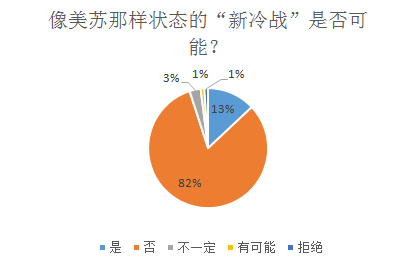 中国不是当年的苏联,美国也不是当年的美国。资本主义和社会主义之间意识形态大对立的全球环境已不存在,国际社会普遍渴望和平与发展。那么,美国如果真想发动对华新冷战,中美会回到美苏那样的冷战状态吗?针对“美苏那样状态的新冷战是否可能”这个问题(图2),82%的中国学者都予以否认,只有13%的中国学者认为,中美是有可能会进入美苏冷战格局的。
