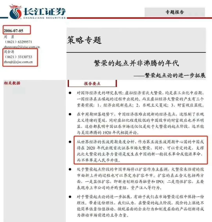 一篇由周勇、周金涛写作发表于2006年7月5日的长江证券研报《繁荣的起点并非沸腾的年代》,6日晚间在网上引发热议。