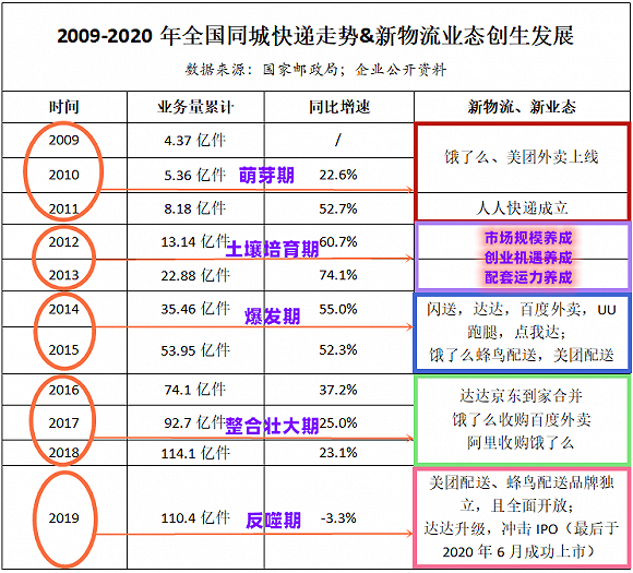 通过图中比对可以看出:最近十年间,同城快递的业务走势与众包物流、即时配送(含外卖)的创立、成长、爆发和崛起密切相关。前五年,同城快递的大爆发,直接催生了这些新业态的萌芽,吸引了众多的创业者甚至巨头公司入局;后五年,同城快递增速平稳趋缓的另一面,则是新业态的强势崛起和全面社会化。
