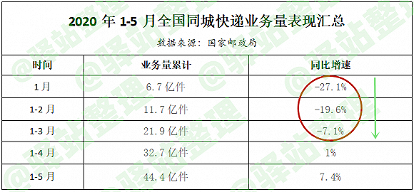 进入2020年,同城快递“负增长”的低迷表现依然未能得到有效扭转。根据国家邮政局发布的月度数据,我梳理了今年前5个月同城快递的表现,具体如下: