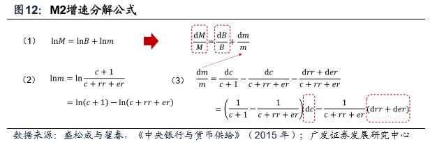 根据决定广义货币M2的基本公式:M2=基础货币(B)*货币乘数(m),可以得到三者增速满足简单的相加关系,M2同比增速=基础货币同比增速+货币乘数同比增速。