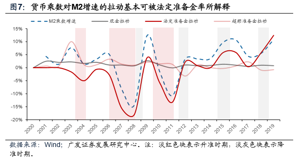 法定存款准备金率对M2的贡献与基础货币经验上严格反向。