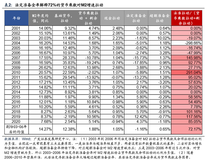 数据显示,2001年以来货币乘数对M2增速拉动,法定存款准备金率对M2增速拉动,两者基本高度正相关,可以说货币乘数对M2增速拉动基本可被法定存款准备金率所解释。事实上,剔除偶然年份(2003年到2006年,详见表2注)之后其余时间货币乘数对M2增速的拉动,基本上72%可被法定存款准备金率所解释。