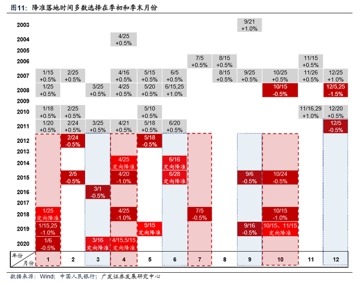 以降准频率和单次降幅力度来看,2011年以后降准在时点选择上具有一些规律,更大概率以及更大幅度的降准通常选择季末和季初月份。
