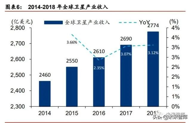 2014-2018 年全球卫星产业复合增速为 3.0%。根据美国卫星产业协会(SIA)发布的《2019 年卫星产业状况报告》(以下简称《卫星报告》),2018 年全球航天经济产业总收入为 3600 亿美元,其中卫星相关产业总收入为 2774 亿美元(YoY+3%),占全球航天经济产业收入 比为 77%;相比地面基站通信,卫星通信使用门槛较高,整体卫星产业增速处于缓慢增长 期,2014-2018 年全球卫星产业复合增速为 3.0%。
