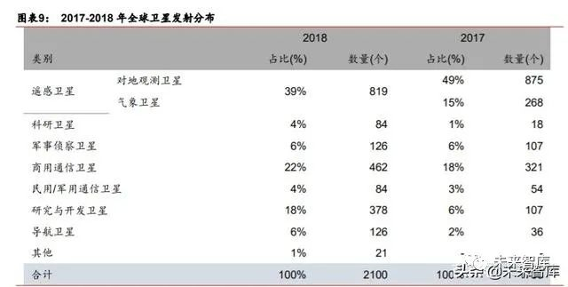 商用通信卫星发射拉动 18 年卫星制造和发射产业收入增长。根据《卫星报告》,2017-2018 年全球分别发射了 345/314 颗卫星,虽然卫星整体新增发射数量同比减少约 10%,但 2018 年卫星制造业收入同比增长了 26%,发射服务业收入同比增长了 34%。从卫星数量占比 来看,商用通信卫星和研究与开发卫星占比大幅提升,其中遥感卫星占比大幅下降,由于 卫星寿命基本在 5-15 年,我们认为可能是部分遥感卫星划归到研究与开发卫星项目中导 致遥感卫星数量大幅下降。因此,我们认为 2018 年整体卫星制造业和发射服务业收入同 比增长的主要原因来自于商业通信卫星量的增加。根据《卫星报告》的显示,2018 年高 通量卫星(HTS)、小卫星和立方体卫星的技术成就已经带来了卫星宽带、制造和发射服 务收入的增长。