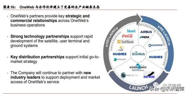 OneWeb 建立了完善的全产业链条生态。公司在卫星制造、发射、运行和营销等各个环 节强力联合了软银集团、空客防务与航天公司、休斯网络系统公司、阿里安航天公司、蓝 色起源公司、罗克韦尔·柯林斯公司、高通公司、可口可乐公司、俄罗斯信使公司、塔利 亚公司、意大利因特马蒂奇公司等龙头企业,形成了一个利益集团。