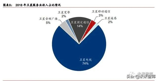 2018 年卫星服务业总收入 1265 亿美元,卫星电视占比最高达 74%。根据《卫星报告》, 2018 年卫星电视直播收入为 942 亿美元(YoY-3%),占卫星服务业收入比重约 74%;卫 星固定通信业务为第二大业务,占卫星服务业收入比重约 14%,收入为 179 亿美元 (YoY+0%);卫星音频广播收入为 58 亿美元(YoY+7%);卫星移动通信收入为 41 亿美 元(YoY+3%);卫星宽带业务收入为 24 亿美元(YoY+14%);遥感领域(包括农业、变 化检测、减灾、气象、资源等)收入为 21 亿美元(YoY-5%)。