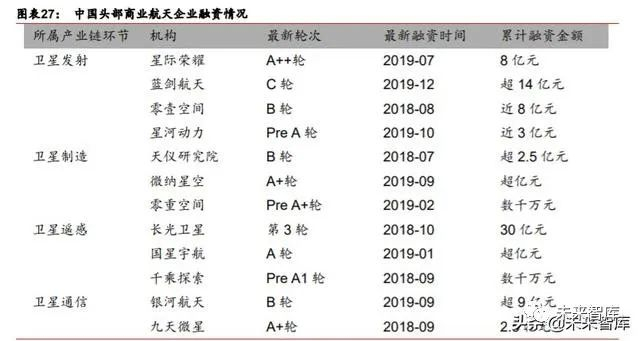 国内方面,2014 年国务院出台了《关于创新重点领域投融资机制鼓励社会投资的指导意 见》首次提出鼓励民间资本参与国家民用空间基础设施建设。鼓励民间资本研制、发射和 运营商业遥感卫星,提供市场化、专业化服务,引导民间资本参与卫星导航地面应用系统 建设。目前,国内众多企业家纷纷涉足商业航天领域,其中银河航天因其创始人徐鸣的影 响力(曾担任互联网公司猎豹移动总裁),令银河航天具有强大的融资能力,截至 2019 年 底银河航天估值超 50 亿元。国内互联网巨头也在积极布局卫星领域,阿里在 2018 年的 “双 11”前发射了“糖果罐号”迷你空间站和“天猫国际号”通讯卫星。