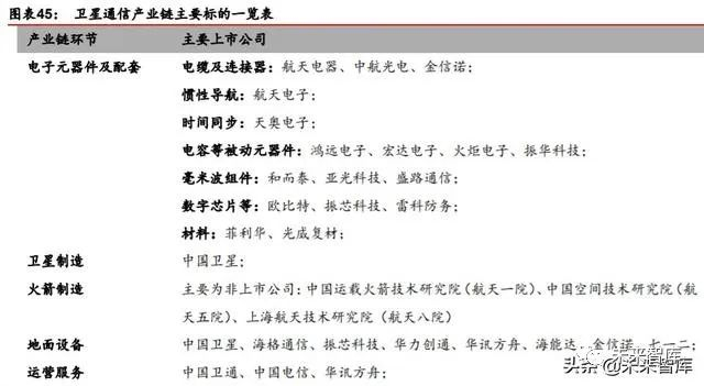 电子元器件及配套领域:电子元器件及配套主要为卫星、火箭和地面设备提供基础元件和 配套组件,产业链厂商涉及面广且分散。目前国内企业规模较小,整体实力偏弱,尤其是 芯片、板卡、天线和终端技术水平与国外顶尖仍有差距,国产替代需求较强。卫星通信主 要是基于毫米波通信频段,低轨卫星载荷主要为通信部分,毫米波通信的核心是毫米波通 信组件及芯片,该领域中电科旗下研究所实力较强,民营企业中和而泰子公司铖昌科技的 毫米波技术有一定稀缺性,中长期将受益低轨卫星建设。