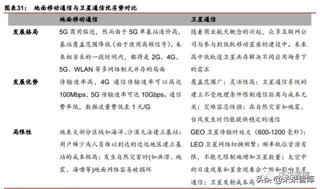 卫星通信与 5G 之间是互补关系。随着信息时代来临,需要联网的空间也越来越多,比如 在飞机上、海洋上乃至戈壁荒漠,而卫星通信最大的优点可以以较低的成本解决全球信号 覆盖的问题。同时因为卫星通信频段较高,信号衰减较大,卫星信号无法完成对室内或者 地下等区域信号的直接覆盖(可以通过盒子或者其他设备进行信号的间接转发)。而基站 在城市以及室内区域覆盖具有较大优势,可以说卫星通信和基站通信两者在信号覆盖上是 互补的。