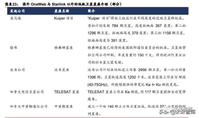 低轨卫通星空璀璨,巨头公司纷至沓来。低轨卫星星座系统具备高稳定性、低时延、不依 赖地面基础设施、轻量化终端以及全球覆盖等优点。除了我们熟悉的 Starlink 星座与 OneWeb 星座,国内外众多科技巨头公司也纷纷涉足低轨卫星星座。根据 2015 年 8 月, 三星公司发表的一篇论文《Mobile Internet from the Heavens》表明其希望发射 4600 颗 微型卫星,为用户提供低成本的互联网接入。根据 CNET 消息,2018 年美联邦通信委员 会(FCC)的一份申请文件披露了一颗造价数百万美元的实验卫星细节,该卫星来自脸书 公司成立的一家子公司。根据 CNBC 消息,亚马逊公布的 Kuiper 星座将由分布在 367 英 里、379 英里和 391 英里轨道高度的 3236 个 Ka 波段卫星组成。尽管航天项目存在较高 的财务风险,但互联网巨头们对低轨卫星星座的热情足以证明其前景广阔。