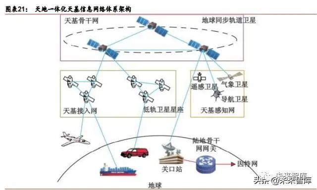 中电科—天地一体化信息网络。根据中电科集团官网信息,天地一体化信息网络重大项目 是中国电科设计出的解决方案——按照“天基组网,地网跨代,天地互联”的思路,以地 面网络为基础、以空间网络为延伸,覆盖太空、空中、陆地、海洋等自然空间,为天基、 陆基、海基等各类用户活动提供信息保障的基础设施。通过融合天基卫星通信网络、空基 飞行器通信网络、地基通信网络,实现天、空、地三网协同,达到全球覆盖、随处接入、 按需服务、安全可信全球网络连通的目标。天地一体化信息网络包含三张网:第一张网是 由各类卫星组成的天基信息网络,将空间中的通信、导航、遥感卫星组成一张协同网络作 为空间信息基础设施;第二张网是由各类飞行器组成的空基通信网络,包括各类飞机、飞 艇、热气球以及无人机等,空基网络多用于中继来沟通天基和地基网络;第三张网是由陆 地通信网构成的地基网络,包括陆地蜂窝网和无线局域网。
