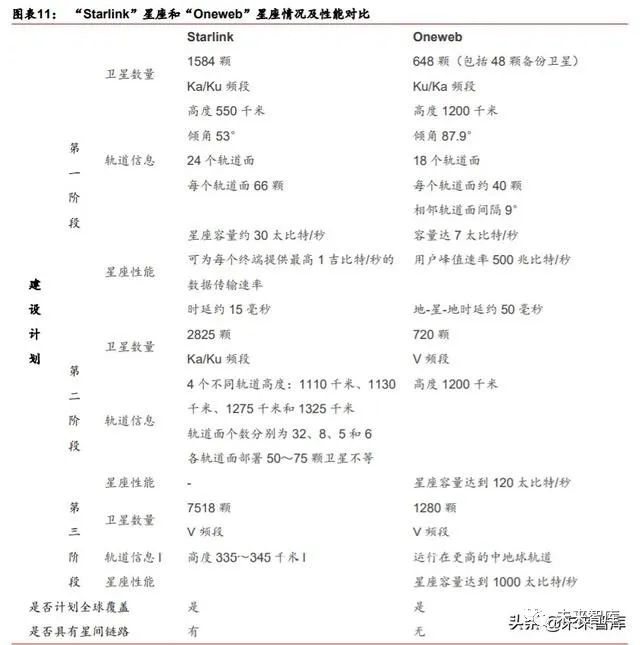 Starlink(星链)与 Oneweb(一网)均计划在 2020 年开启商业化进程,并分三阶段实 现覆盖全球的卫星互联网,具体的星座情况及性能对比如下: