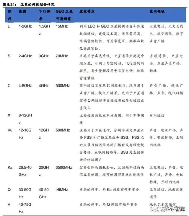 轨道频率资源是空间互联网建设的先决条件。国际上卫星通信系统可以使用的频段包括甚 高频(VHF)、特高频(UHF)、超高频(SHF)和极高频(EHF)。受限于无线通行特性、 技术与设备等方面限制,目前低轨卫星主要包括 UHF 频段、L 片段、C 频段、X 频段、 Ku 频段、Ka 频段。其中低于 2.5GHz 的 L 和 S 频段主要用于卫星移动通信、卫星无线电 测定、卫星测控链路等应用;C 和 Ku 频段主要用于卫星固定业务通信且已近饱和,Ka 频 段正在被大量投入使用。
