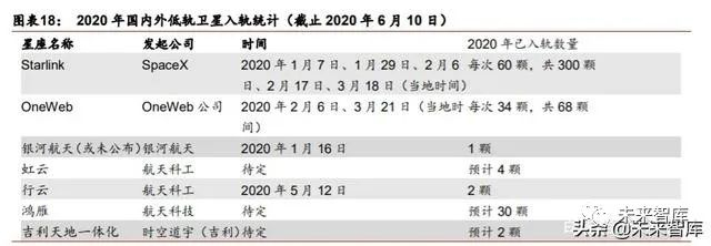 海外商用计划推动了低轨卫星产业链的发展,国内已开始发射试验卫星。Starlink 与 Oneweb 今年分别计划入轨 1440 与 360 颗互联网卫星,2021 年开始正式商用运营。Oneweb 公司于 2 月 7 日发射 34 颗低轨卫星,这是该公司今年首次发射低轨卫星。SpaceX 于 6 月 3 日再次发射 60 颗 Starlink 低轨卫星。国内方面,1 月 16 日,银河航天首发星搭 载快舟一号甲运载火箭发射成功,成为中国首颗通信能力达 10Gbps 的低轨宽带通信卫星。由中国航天科工集团主导的虹云工程、行云工程以及中国航天科技集团主导的鸿雁工程此 前均已发射首颗试验星,目前行云工程已于 2020 年 5 月成功发射 2 颗低轨卫星,虹云工 程计划于 2020 年左右发射 4 颗低轨卫星。