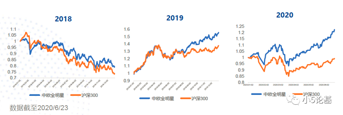 中欧股票全明星组合在2018年,2019年以及今年以来(截至2020年6月23日)的收益率分别为-21.03%,56.17%和47.16%,每一年度跑赢沪深300指数还是非常明显的。