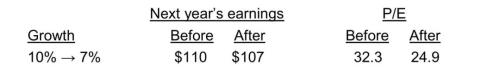 注意到第二年的增长仅仅降低了2.7%,但公允的P/E倍数陡降了22.9%。投资者通常用当前价格除以下一年盈利来计算P/E值。因此,有时候他们相信市场对近期盈利的小幅变化过度反应了。但如果对增长的轨道增速预期确实下行了,P/E倍数的明显下降是完全合理的。