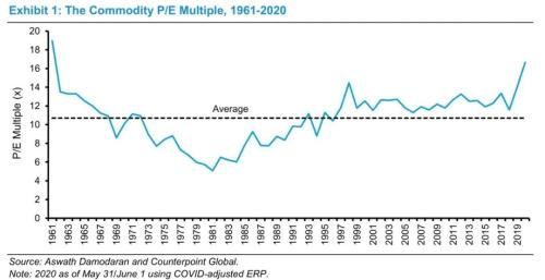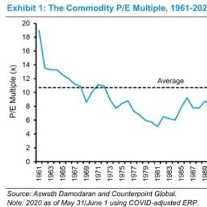 权益资金成本从而通用P/E倍数(commodity P/E multiple)的变动是因为无风险利率和股权风险溢价的变动。图一展示了通用P/E倍数(commodity P/E multiple)从1961年到2020年5月间的情况。这些倍数是基于Aswath Damodaran估测的股权风险溢价计算而来的,Damodaran是纽约大学Stern商学院在估值方面的优秀的专家。