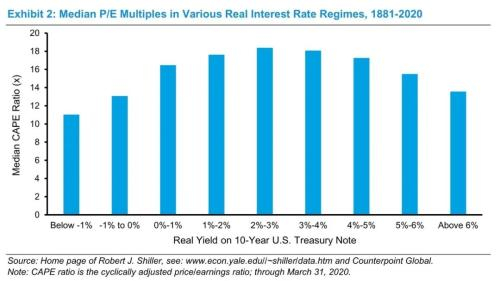 数据显示,更慢的增长赢得了这场战争。因此,市场的P/E倍数历史上跟随一个倒U型。与“金发女孩原则”(即凡事不能过度)一致,低的平均P/E倍数与很低的和很高的利率相关(经过通胀调整后),高的平均P/E倍数则与在中间区域的真实利率相关。