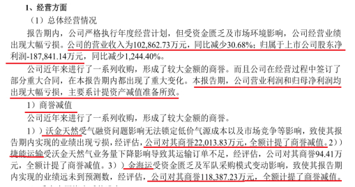 可是,刚过了业绩承诺期,李霞名下的公司限售股尚未来得及解禁,金海运就“东窗事发”。2018年度,据天海防务年报披露,当期公司营业收入为10.29亿元,同比下滑30.68%,归属净利润亏损高达18.78亿元。导致公司巨额亏损的第一大原因,就是巨额商誉减值。其中,金海运全额计提商誉减值11.84亿元,上海沃金天然气利用有限公司全额计提商誉减值2.20亿元,上海捷能天然气运输有限公司全额计提商誉减值94.41万元。金海运计提商誉减值金额11.84亿元,占当期归属净利润亏损金额之比为63.05%,是导致2018年度经营业绩亏损的主要原因。