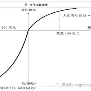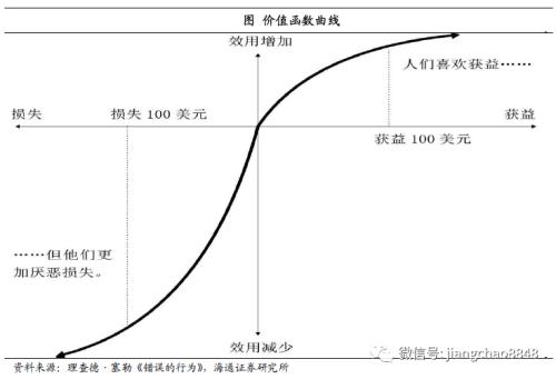 同等损失造成的伤害大于获益带来的快乐。人在面临获利时,不愿冒风险,而在面临损失时,人人都成了冒险家。这种行为可以用价值函数曲线来表示,曲线上半部分代表受益,下半部分代表损失,损失函数曲线比获益函数曲线的走势更加陡峭,即损失造成的伤害大于收益带来的快乐,这种现象被称为“损失厌恶”。市场暴跌时人们是风险爱好者,而连续上涨时则倾向选择落袋为安。