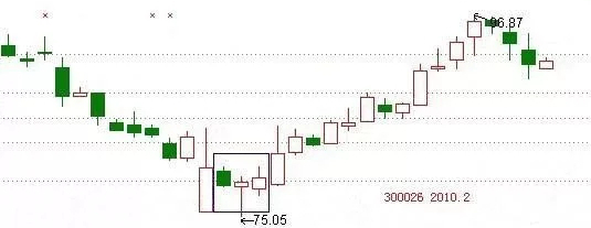 红日药业(300026),2010年2月初,股价在经过一个经典的启明星底部形态后完成了漂亮的趋势逆转,细心地读者注意在这个启明星之前一个K线还是个标志性的底部天量大阳线,配合以启明星底部形态,我们可以基本认定底部成立。从后来走势看,短线出现了近30%的涨幅。
