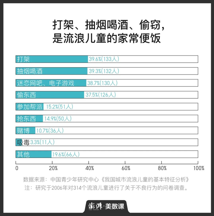 而中国青少年研究中心对314个样本的问卷调查也显示,2006年前后,打架和偷窃已经成为流浪儿童的家常便饭。