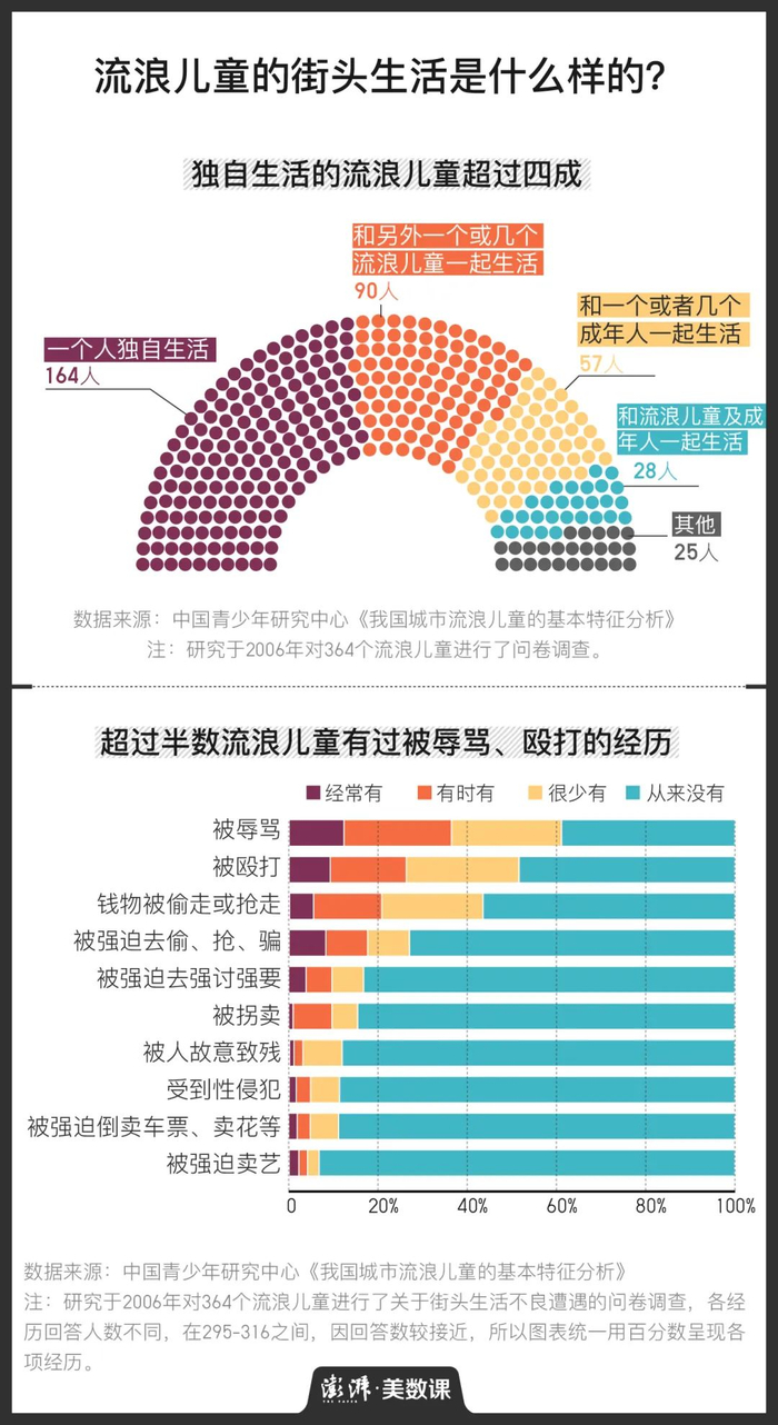 根据中国青少年研究中心的调查,超过四成的流浪儿童独自生活,而一半以上的流浪儿童有过不同程度、不同方面的不良遭遇。在309个流浪儿童中,有11.3%遭遇过性侵;在295个流浪儿童中,有11.9%甚至面临过被人故意致残的危险。