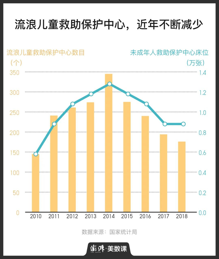 从2015年起流浪儿童救助保护中心的数量开始减少,2018年《中国儿童发展纲要(2011—2020年)》统计监测报告给出的解释是,“随着国家对儿童保护工作的不断加强,孤儿数量逐年下降,儿童保护机构数量也随之稳中有减”。2019年召开的全国儿童福利工作会议也透露,“随着孤弃儿童、流浪儿童数量大幅减少,有的机构已经出现床位、设施设备闲置现象”。