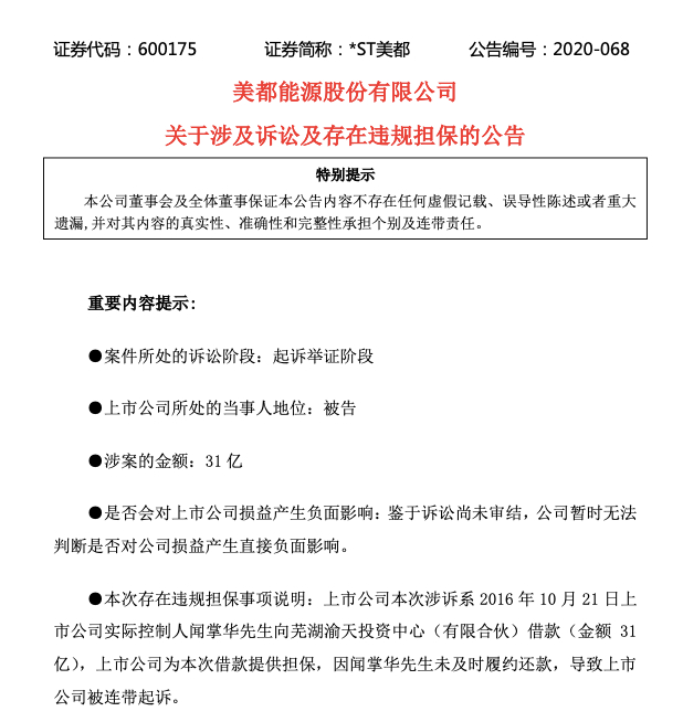 据上市公司美都能源公告显示,该公司因金融借款合同纠纷作为被告被起诉。据悉,原告芜湖渝天投资中心将31亿元资金委托给国投泰康信托,用于向美都能源实控人发放贷款,但实控人未能按时还款,且美都能源已进入退市整理期。
