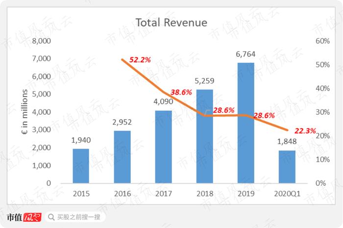 2020年一季度,公司总收入为18.5亿欧元,同比增长22%,而去年同期的收入增速为33%。
