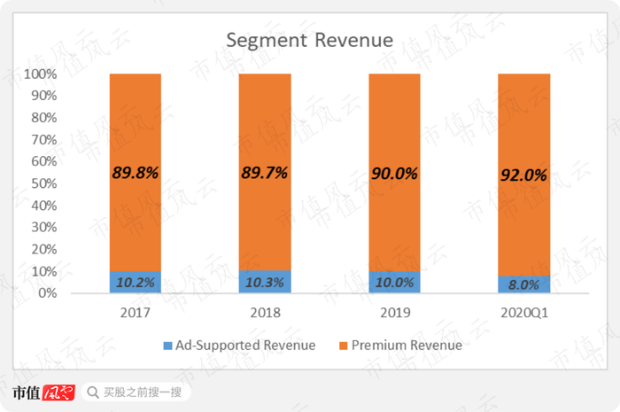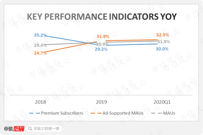 2019年及2020年一季度,付费用户的同比增速分别为29.2%和30.0%,分别较同期的广告支持用户增速低2.7个百分点和2.5个百分点。