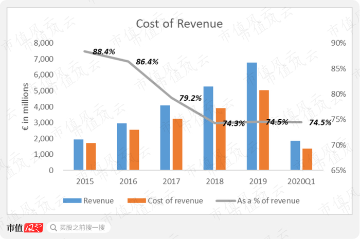 以2019年为例,当年销售、管理和研发三项费用合计占同期收入的27%。但单是生产成本一项就占同期收入的75%。